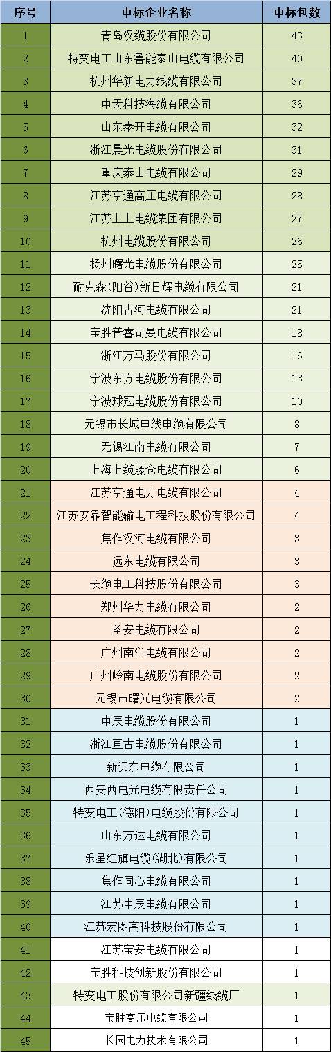 前十家电力电缆企业中标包数占总数的64%,分别是青岛汉缆股份有限公司、特变电工山东鲁能泰山电缆有限公司、杭州华新电力线缆有限公司、中天科技海缆有限公司、山东泰开电缆有限公司、浙江晨光电缆股份有限公司、重庆泰山电缆有限公司、江苏亨通高压电缆有限公司、江苏上上电缆集团有限公司、杭州电缆股份有限公司。
