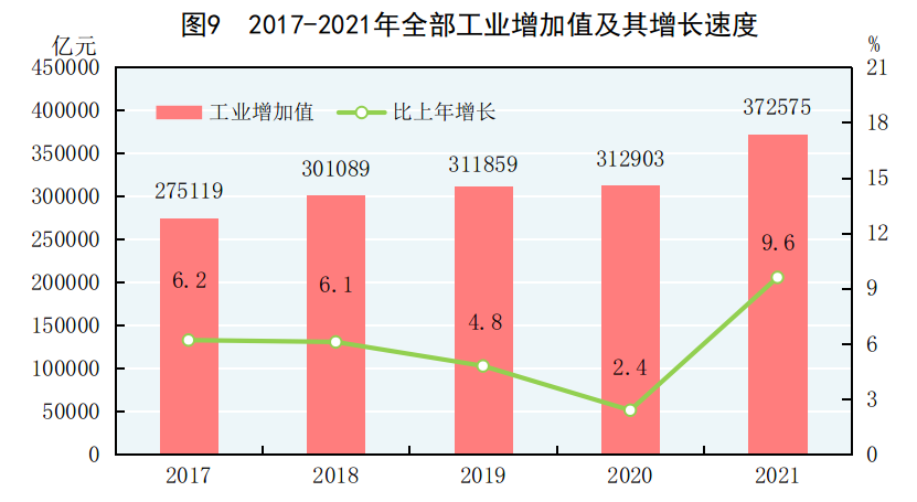 全年全部工业增加值372575亿元,比上年增长9.6%。规模以上工业增加值增长9.6%。在规模以上工业中,分经济类型看,国有控股企业增加值增长8.0%;股份制企业增长9.8%,外商及港澳台商投资企业增长8.9%;私营企业增长10.2%。分门类看,采矿业增长5.3%,制造业增长9.8%,电力、热力、燃气及水生产和供应业增长11.4%。